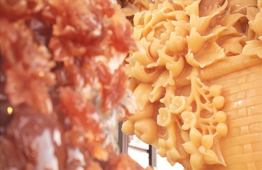 | Chủ nhân giỏ hoa Tết này cho biết, giỏ hoa này được tạo nên từ một viên ngọc quý, nguyên khối nặng 8 tấn có nguồn gốc từ Iran. Giỏ hoa này được làm trong 3 tháng với 6 tay thợ lành nghề. |