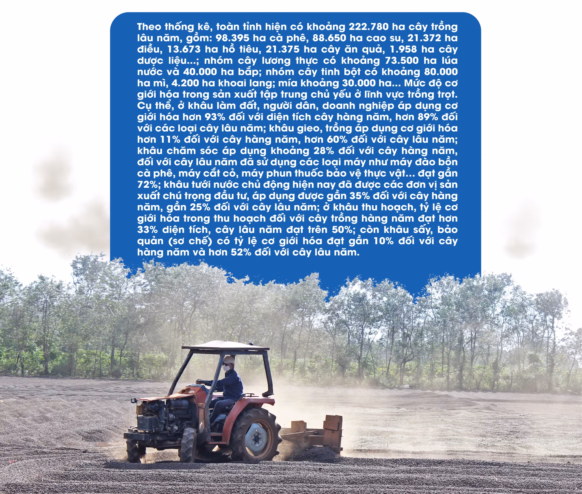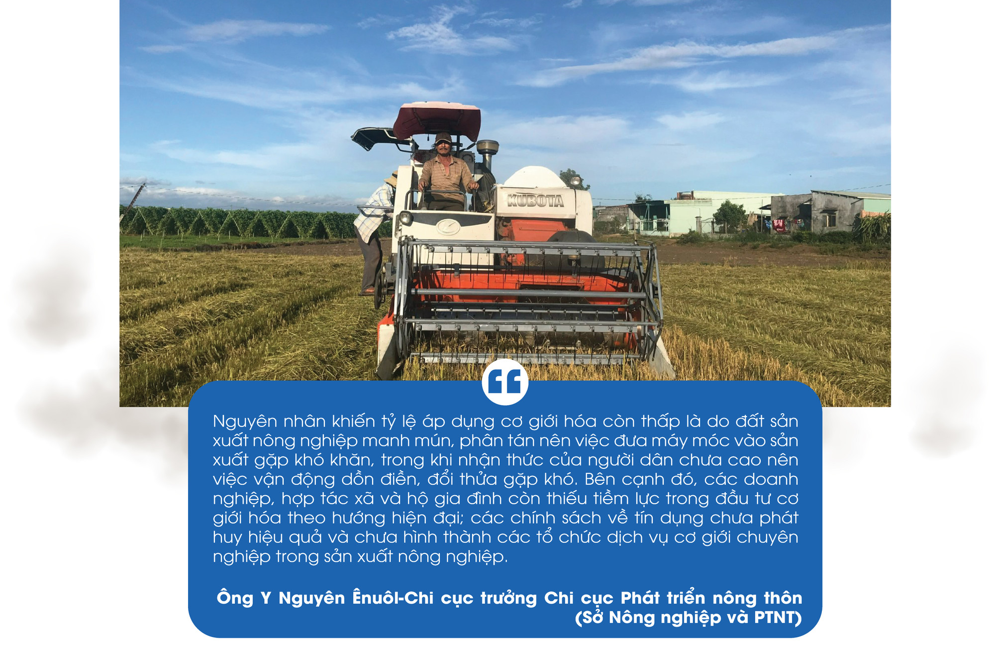 Ông Y Nguyên Ênuôl-Chi cục trưởng Chi cục Phát triển nông thôn (Sở Nông nghiệp và PTNT) cho biết: Chính sách cơ giới hóa đã thay đổi tư duy sản xuất nông nghiệp của bà con nông dân trong tỉnh. Song nhìn chung, các khâu trong cơ giới hóa chưa đủ mạnh, chưa đáp ứng nhu cầu về sản xuất, chế biến nông-lâm sản; tỷ lệ cơ giới hóa ở một số khâu còn thấp như gieo cấy, chăm sóc, chế biến tinh. Thiết bị cơ giới chủ yếu do hộ gia đình và doanh nghiệp đầu tư hoặc Nhà nước hỗ trợ thông qua hoạt động khuyến công, hỗ trợ lãi suất.