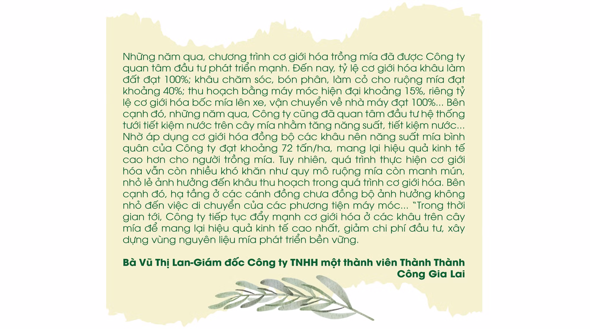 Bên cạnh đó, tỉnh đã khuyến khích, tạo điều kiện để các doanh nghiệp tham gia liên kết sản xuất đầu tư cơ giới hóa vào sản xuất sản phẩm nông nghiệp theo hướng hiện đại, khép kín và bền vững tại vùng nguyên liệu. Cụ thể như: chuỗi liên kết sản xuất mía đường khép kín của Công ty TNHH một thành viên Thành Thành Công Gia Lai; sản xuất gỗ rừng trồng của Công ty MDF; sản xuất, chế biến rau, quả xuất khẩu của Công ty TNHH một thành viên Xuất nhập khẩu rau quả Doveco Gia Lai… và sự liên kết sản xuất của nông dân với một số doanh nghiệp vừa và nhỏ khác đã góp phần nâng cao giá trị sản phẩm, hiệu quả sản xuất nông nghiệp trên địa bàn.