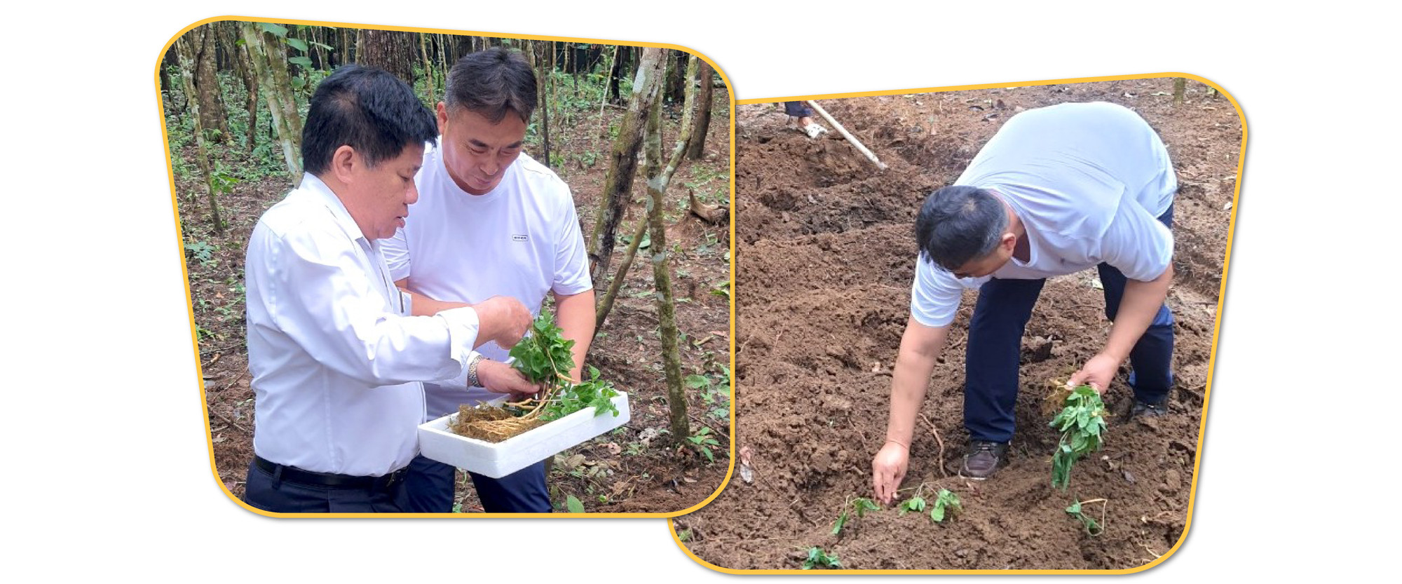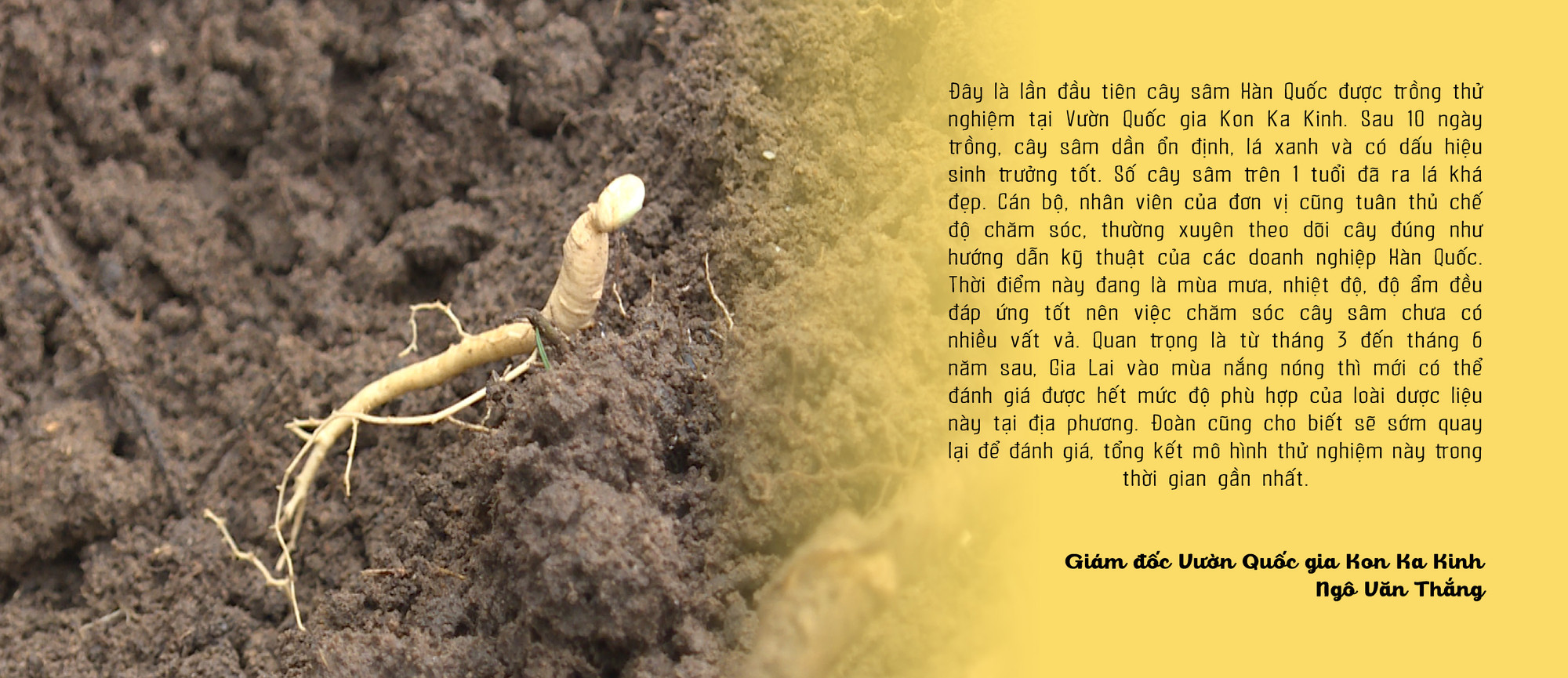 Trên cơ sở đó, tại buổi tham quan và làm việc với Vườn Quốc gia Kon Ka Kinh, qua khảo sát chất đất, điều kiện tự nhiên, đoàn doanh nghiệp đã quyết định trồng thử nghiệm gần 500 cây sâm Hàn Quốc từ 1 đến 3 năm tuổi trong khu vực Trung tâm Cứu hộ, bảo tồn và phát triển sinh vật trên diện tích khoảng 120 m2. Các chuyên gia đã hướng dẫn cách làm luống, kỹ thuật trồng cũng như chăm sóc cây sâm cho cán bộ và nhân viên của Vườn.