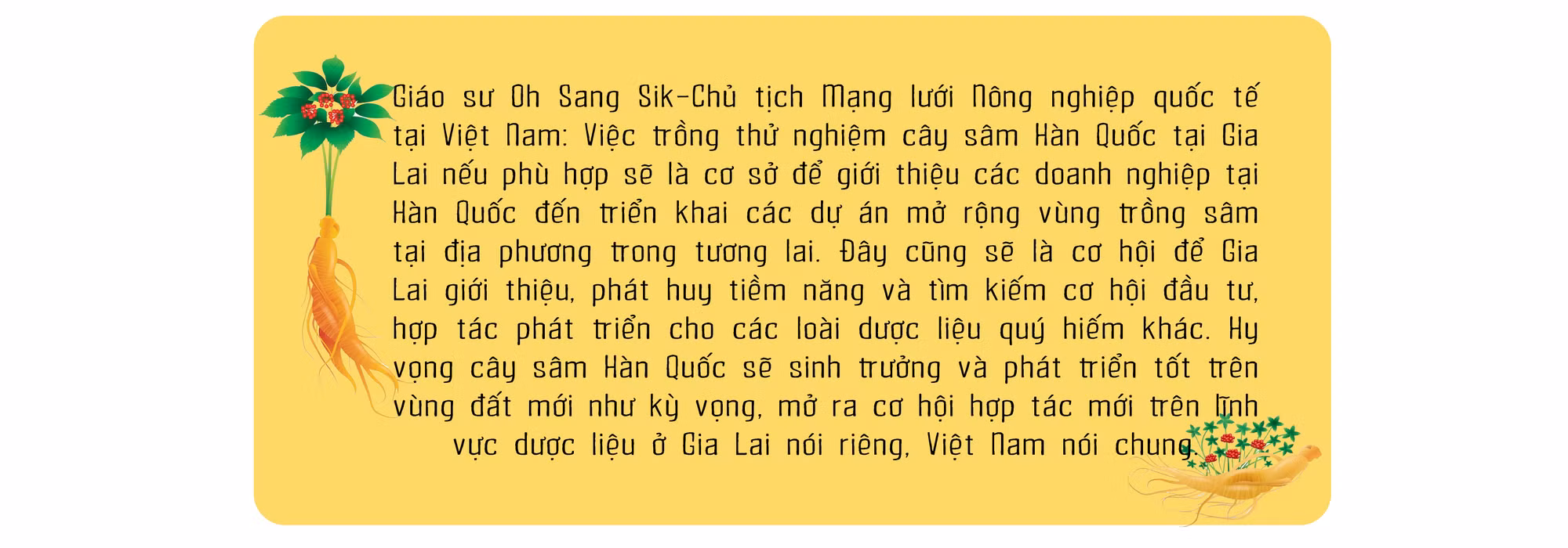 Trong chuyến khảo sát, các doanh nghiệp Hàn Quốc rất quan tâm đến các loài dược liệu của tỉnh. Đặc biệt, các doanh nghiệp cũng tìm kiếm môi trường phù hợp để trồng sâm Hàn Quốc. Là người có nhiều năm kinh nghiệm trong việc trồng và xuất khẩu sâm Hàn Quốc, ông Namgung Yoon-soo-Giám đốc Điều hành Hiệp hội Nhân sâm Jeonbuk-chia sẻ: “Cây sâm Hàn Quốc thích hợp với vùng có thời tiết từ 20 đến 25 độ C, lượng mưa trung bình 1.100-1.300 mm/năm, độ pH của đất 5-6, chất đất pha cát sỏi. Cây sâm nếu được trồng bên sườn hướng về phía Bắc thì sẽ phát triển tốt hơn. Bên cạnh đó, sau khi trồng, việc quản lý phải được thực hiện thật tốt. Dịp này, chúng tôi rất muốn được tìm hiểu, khảo sát trực tiếp các vùng có điều kiện tương ứng ở Gia Lai để trồng thử nghiệm, hướng tới việc phát triển loài sâm này tại đây”.