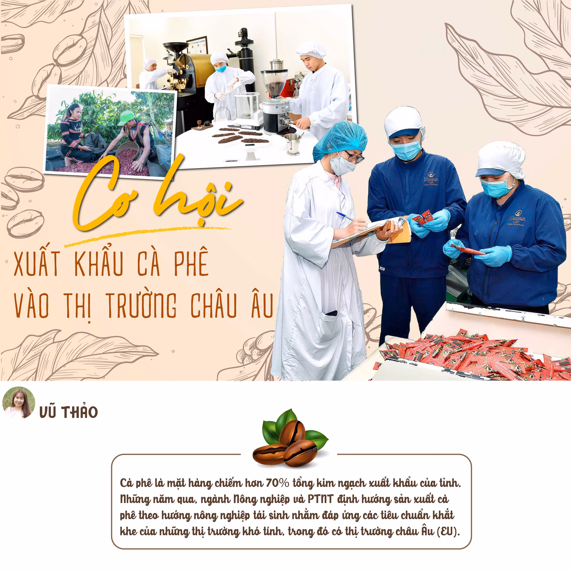 Cà phê là một trong những cây trồng chủ lực của tỉnh với diện tích hơn 100.000 ha, trong đó có hơn 87.000 ha đang kinh doanh, năng suất bình quân đạt 3 tấn nhân/ha, tổng sản lượng đạt hơn 267.000 tấn nhân/năm. Mỗi năm, toàn tỉnh tái canh khoảng 1.500 ha cà phê già cỗi, sâu bệnh bằng những loại giống mới chất lượng cao. Hiện nay, toàn tỉnh có khoảng 46.000 ha cà phê được chứng nhận sản xuất theo các tiêu chuẩn như VietGAP, Rainforest, Organic…