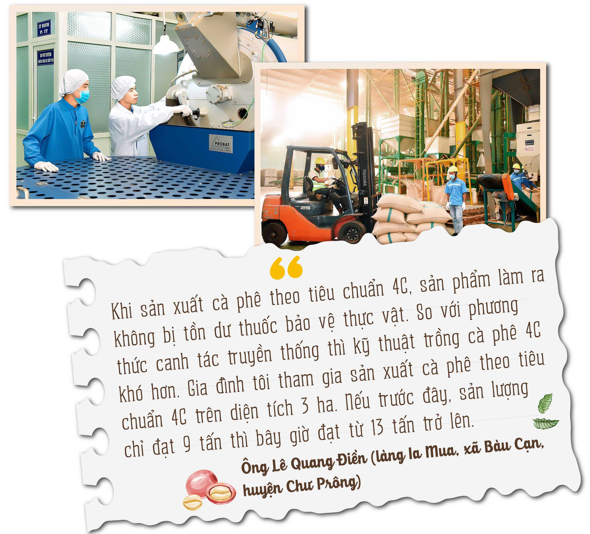 Hiện nay, giá cà phê đang ở mức cao, giá trị kinh tế mang lại trên một đơn vị diện tích cao hơn nhiều loại nông sản khác. Do đó, người nông dân đã chú trọng hơn đến việc ứng dụng khoa học kỹ thuật, tham gia các chuỗi liên kết sản xuất cà phê bền vững. Ông Uê (làng Tuơh Klah, xã Glar, huyện Đak Đoa) cho hay: “Tôi là nhóm trưởng nhóm sản xuất cà phê theo tiêu chuẩn 4C ở xã Glar. Nhóm có 100 hộ với diện tích hơn 200 ha. Chúng tôi đã liên kết với Công ty TNHH Vĩnh Hiệp sản xuất cà phê 4C từ năm 2015. Khi liên kết, bà con nông dân được hướng dẫn quy trình kỹ thuật chăm sóc cà phê. Sản xuất cà phê 4C theo bộ quy tắc kỹ thuật hướng dẫn, năng suất đạt 4-5 tấn nhân/ha, còn làm theo phương pháp cũ chỉ khoảng 2 tấn. Đặc biệt, khi thu mua, Công ty có cộng thưởng cao hơn giá thị trường khoảng 200 đồng/kg”.