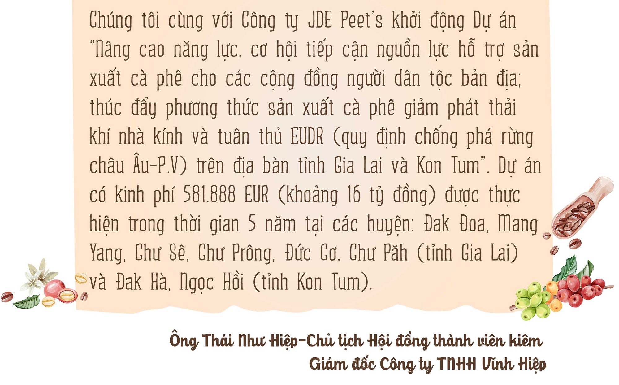 | Công ty TNHH Vĩnh Hiệp và Công ty JDE Peet’s phối hợp thực hiện dự án hỗ trợ người nông dân sản xuất cà phê đáp ứng các yêu cầu về giảm phát thải khí nhà kính và tuân thủ EUDR trên địa bàn tỉnh Gia Lai và Kon Tum. |