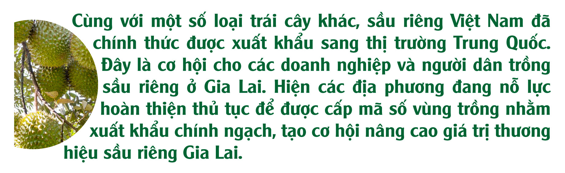 Với điều kiện thuận lợi về thổ nhưỡng, khí hậu, những năm qua, Gia Lai đã tập trung phát triển nhiều loại cây ăn quả chất lượng cao. Đến nay, toàn tỉnh có hơn 4.000 ha sầu riêng, trong đó có hơn 1.700 ha đã cho thu hoạch, năng suất đạt gần 25 tấn/ha. Trong đó, các giống: Dona, Ri6, Musang King đang được nông dân canh tác theo hướng nông nghiệp sạch, từng bước hình thành chuỗi liên kết. Hiện sầu riêng trên địa bàn tỉnh chủ yếu bán cho thương lái mang đi tiêu thụ tại các tỉnh miền Trung và miền Bắc vì chưa có cơ sở chế biến được cấp mã số cơ sở đóng gói phục vụ xuất khẩu. Thời gian qua, bên cạnh việc đẩy mạnh công tác tuyên truyền, tập huấn để bà con nông dân nhận thấy tầm quan trọng của việc xây dựng mã số vùng trồng gắn với truy xuất nguồn gốc, ngành Nông nghiệp tỉnh và các địa phương đang tích cực tập trung hướng dẫn, hỗ trợ các HTX, người dân thiết lập, xây dựng mã số vùng trồng, chuẩn bị điều kiện cần thiết, sẵn sàng cho xuất khẩu chính ngạch sầu riêng sang thị trường Trung Quốc.