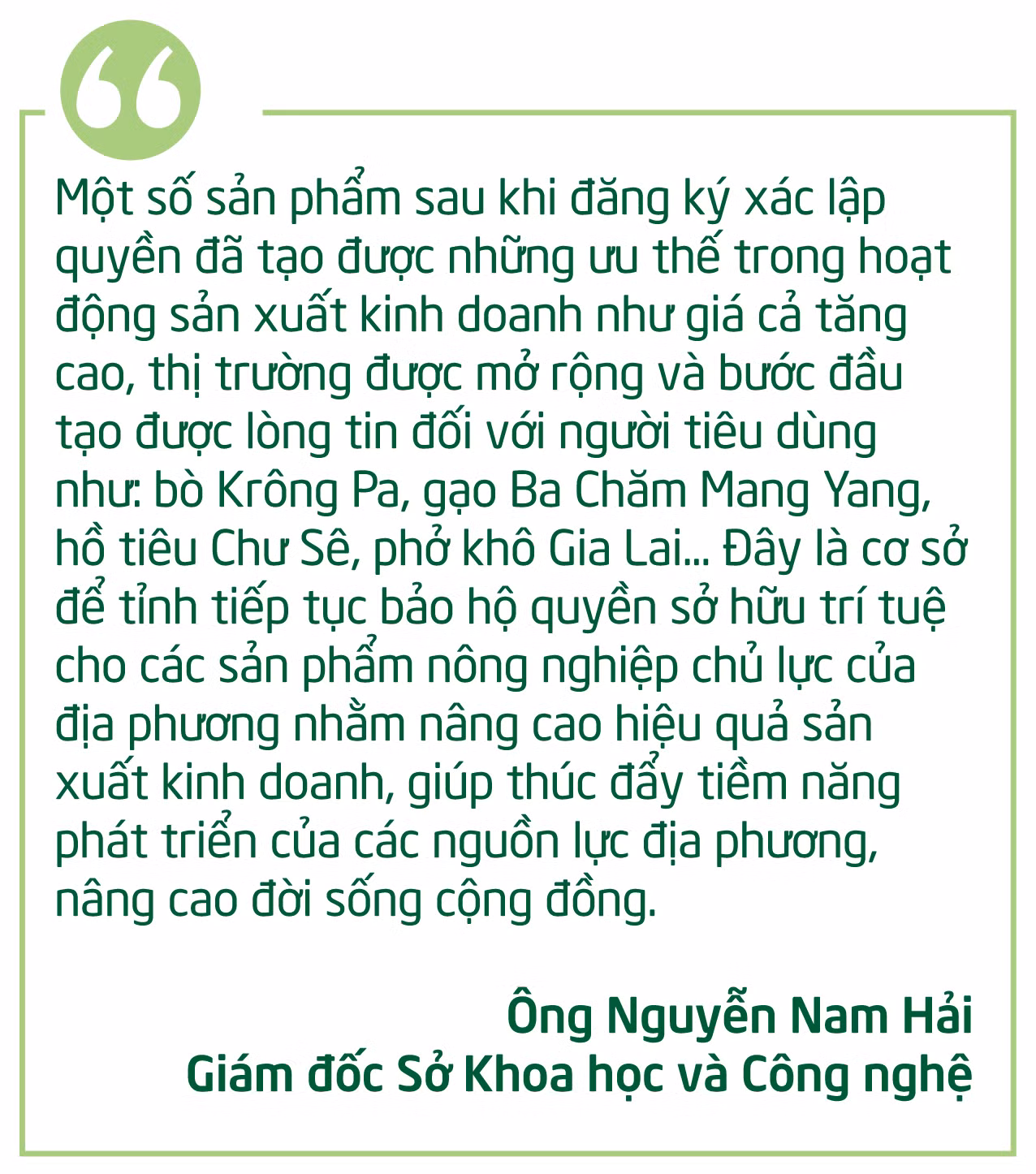 Bên cạnh thiết lập vùng trồng thì việc xây dựng thương hiệu cho sản phẩm sầu riêng của tỉnh cũng hết sức quan trọng. Giai đoạn 2016-2022, Sở Khoa học và Công nghệ đã hỗ trợ và chủ trì lập hồ sơ xác lập quyền cho 10 sản phẩm địa phương được cấp văn bằng bảo hộ, 3 sản phẩm đã nộp đơn đăng ký bảo hộ dưới hình thức nhãn hiệu chứng nhận và có quyết định chấp nhận đơn hợp lệ của Cục Sở hữu trí tuệ, 1 sản phẩm trong giai đoạn hoàn thiện hồ sơ để nộp đơn xin chứng nhận nhãn hiệu. Nói về việc hỗ trợ và chủ trì lập hồ sơ xác lập quyền sở hữu trí tuệ cho sản phẩm sầu riêng, ông Nguyễn Nam Hải-Giám đốc Sở Khoa học và Công nghệ-cho hay: “Nhằm đảm bảo uy tín, chất lượng và nâng cao tính cạnh tranh, khẳng định ưu thế đặc sản sầu riêng Gia Lai, thời gian đến, Sở sẽ phối hợp với các địa phương hoàn thiện các thủ tục để đăng ký bảo hộ quyền sở hữu trí tuệ cho sản phẩm này. Việc đăng ký bảo hộ và quản lý, sử dụng nhãn hiệu các sản phẩm nông nghiệp chủ lực đã được bảo hộ quyền sở hữu công nghiệp có ý nghĩa lớn, tạo thương hiệu có tính bền vững cao.