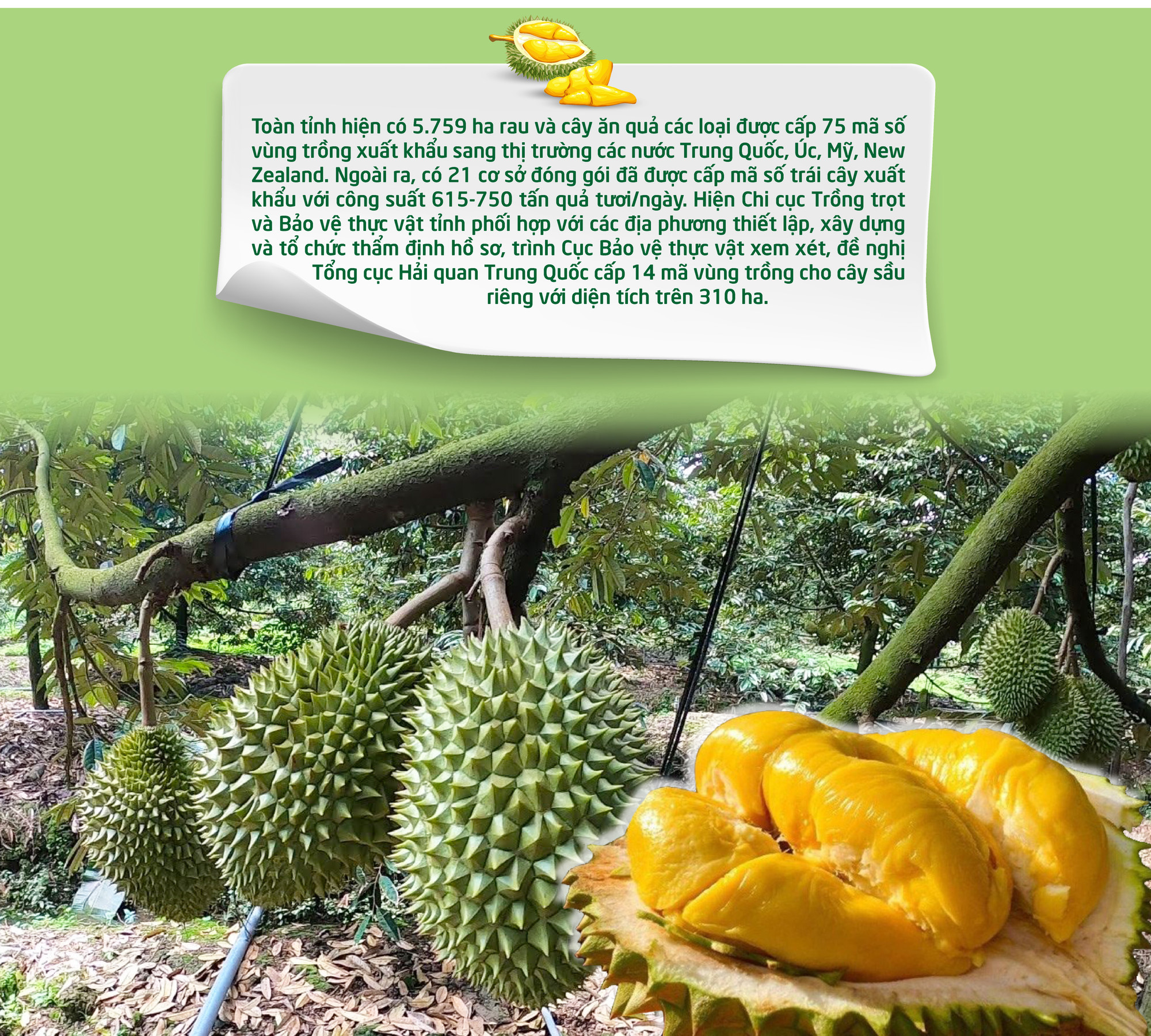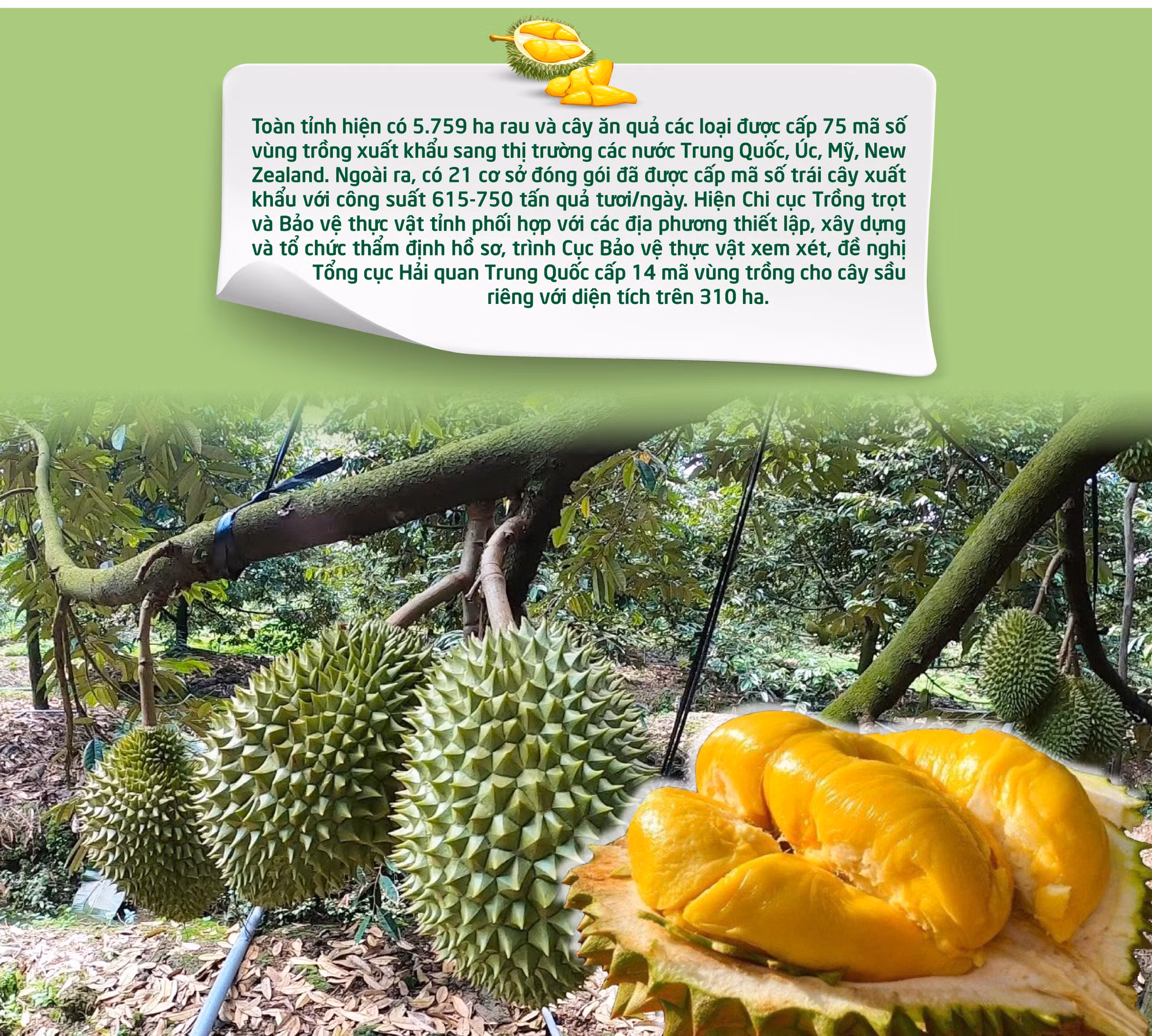 Trao đổi với P.V, ông Đoàn Ngọc Có-Phó Giám đốc Sở Nông nghiệp và PTNT-cho biết: Một trong những tiêu chuẩn xuất khẩu vào thị trường Trung Quốc là xây dựng mã số vùng trồng, mã số cơ sở đóng gói. Đối với thị trường này, 2 tiêu chí quan trọng là tồn dư thuốc bảo vệ thực vật và các loại dịch hại trên quả sầu riêng. Do đó, để sầu riêng xuất khẩu bền vững thì người dân và các HTX cần tuân thủ đúng các tiêu chuẩn mà phía Trung Quốc đưa ra. “Nghị định thư cho phép nhập khẩu mới là điều kiện cần, còn điều kiện đủ là phải sản xuất đảm bảo chất lượng. Việc này phải làm đồng bộ từ khâu tổ chức sản xuất đến thu hái, bảo quản, sơ chế, chế biến”-Phó Giám đốc Sở Nông nghiệp và PTNT thông tin.