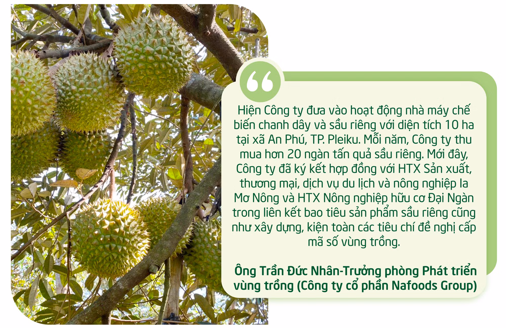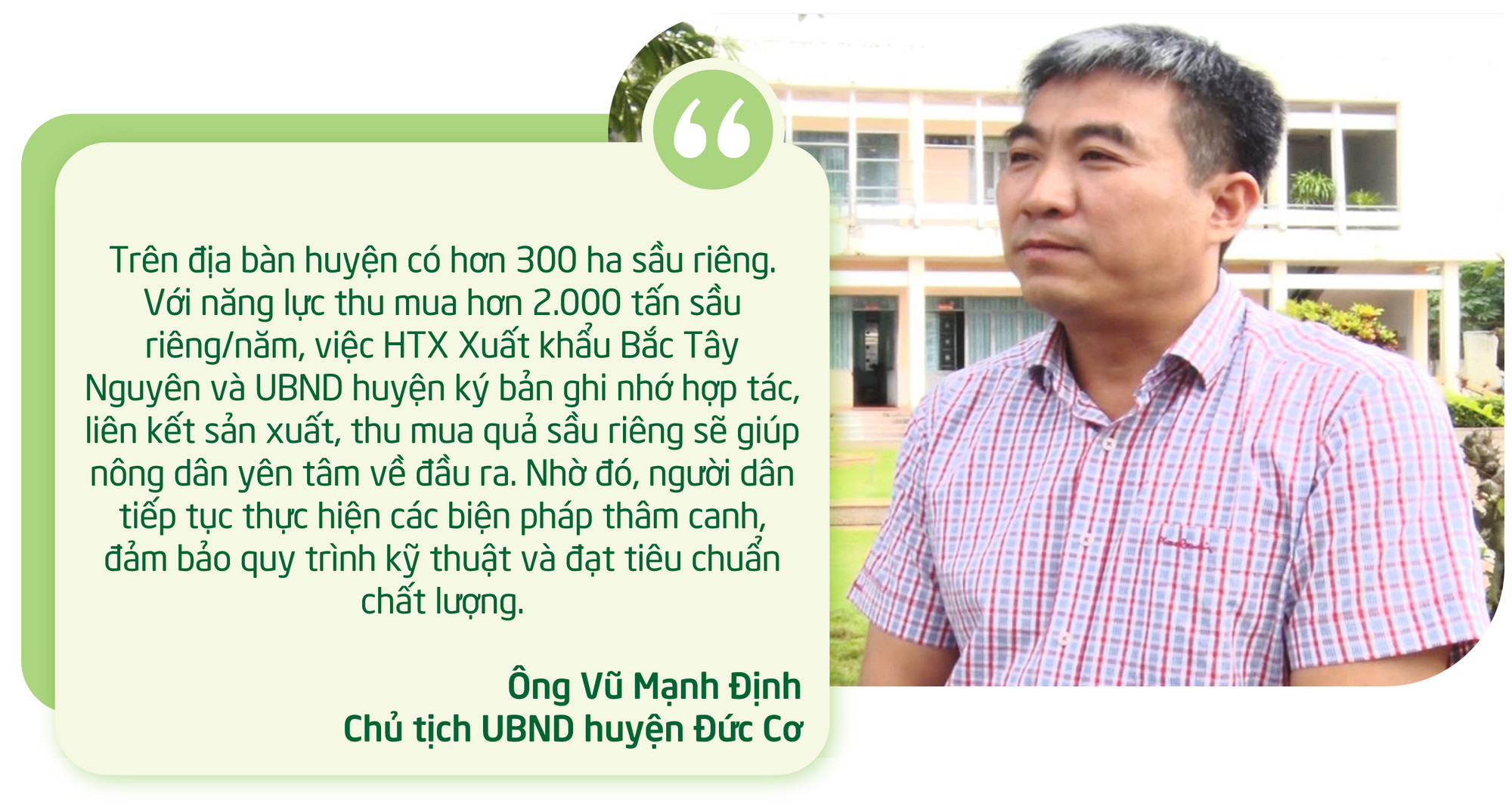 Mới đây, UBND huyện Đức Cơ và HTX Xuất khẩu Bắc Tây Nguyên đã ký bản ghi nhớ hợp tác, liên kết sản xuất, thu mua sản phẩm sầu riêng trên địa bàn. Theo đó, HTX Xuất khẩu Bắc Tây Nguyên sẽ xây dựng xưởng sơ chế và kho đông lạnh bảo quản sầu riêng phục vụ xuất khẩu, thu mua quả sầu riêng, gắn với hỗ trợ nông dân tham gia chuỗi liên kết. Đồng thời, HTX hỗ trợ chuyển giao khoa học công nghệ trong canh tác sầu riêng đạt tiêu chuẩn xuất khẩu. Huyện Đức Cơ sẽ hỗ trợ HTX xây dựng nhãn hiệu, mã số vùng trồng và truy xuất nguồn gốc cho sản phẩm sầu riêng.