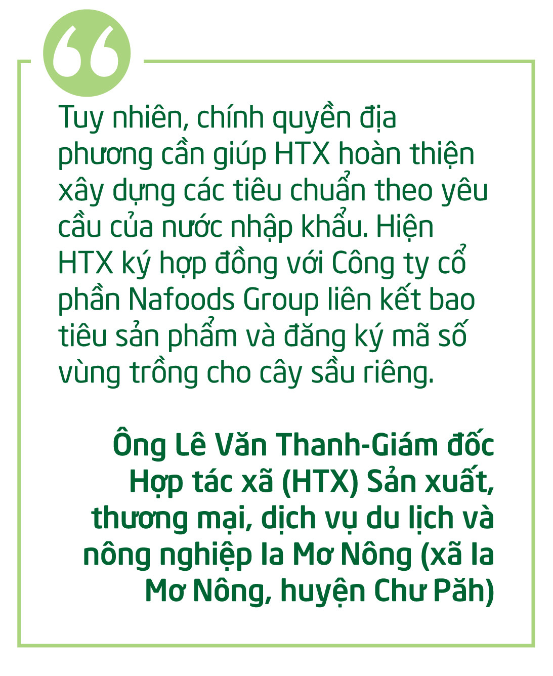 Những ngày này, Hợp tác xã (HTX) Sản xuất, thương mại, dịch vụ du lịch và nông nghiệp Ia Mơ Nông (xã Ia Mơ Nông, huyện Chư Păh) đang tập trung xây dựng nhằm hoàn thiện 2 mã vùng trồng cho 250 ha sầu riêng để hướng đến xuất khẩu chính ngạch sang Trung Quốc. Ông Lê Văn Thanh-Giám đốc HTX-cho biết: Mục tiêu của HTX là xuất khẩu quả sầu riêng sang Trung Quốc. Muốn vậy, chúng tôi phải hoàn thiện quy trình thiết lập mã số vùng trồng.
