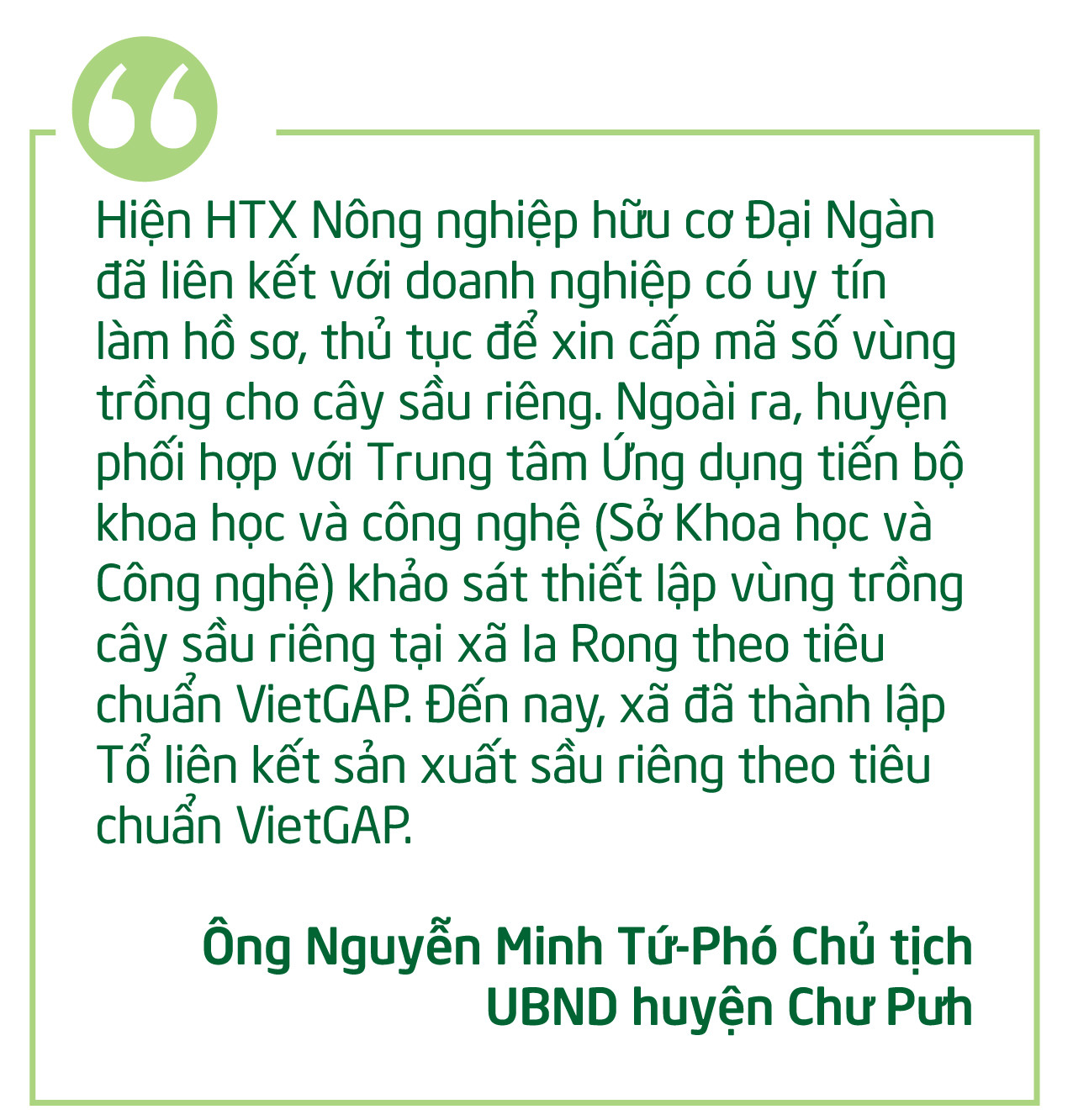 Những năm qua, huyện Chư Pưh đã hình thành vùng chuyên canh cây sầu riêng, song sản xuất còn nhỏ lẻ, chưa liên kết để tạo thành vùng nguyên liệu ổn định đáp ứng nhu cầu của doanh nghiệp thu mua xuất khẩu. Hiện sản phẩm sầu riêng của HTX Nông nghiệp hữu cơ Đại Ngàn (xã Ia Blứ) được cấp giấy chứng nhận theo tiêu chuẩn VietGAP.