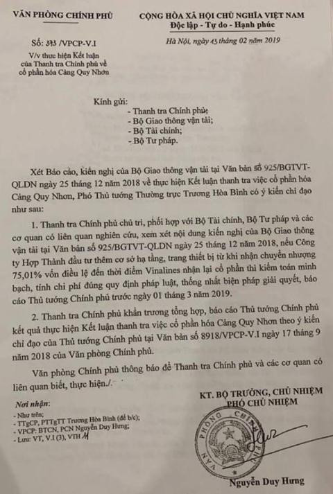 Văn bản của Văn phòng Chính phủ truyền đạt ý kiến chỉ đạo của Phó Thủ tướng Thường trực Trương Hòa Bình về việc thực hiện kết luận thanh tra cổ phần hóa cảng Quy Nhơn.