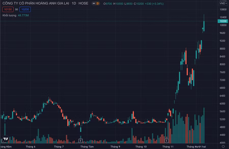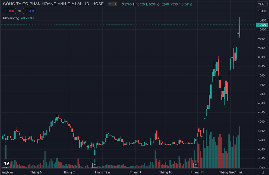 Theo đó, mã chứng khoán HAG có lúc kịch trần nhưng ngay sau đó điều chỉnh nhẹ, giao dịch ở giá 10.200 đồng/cổ phiếu. Thanh khoản tăng cao tới hơn 48 triệu cổ phiếu khớp lệnh.