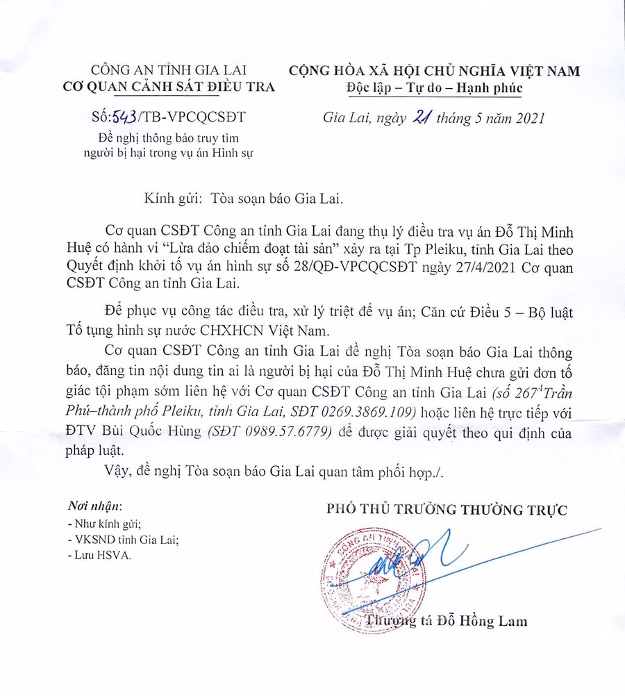 (GLO)- Cơ quan Cảnh sát Điều tra Công an tỉnh Gia Lai vừa có Thông báo số 543/TB-VPCQCSĐT về việc truy tìm người bị hại trong vụ án Đỗ Thị Minh Huệ có hành vi lừa đảo chiếm đoạt tài sản.