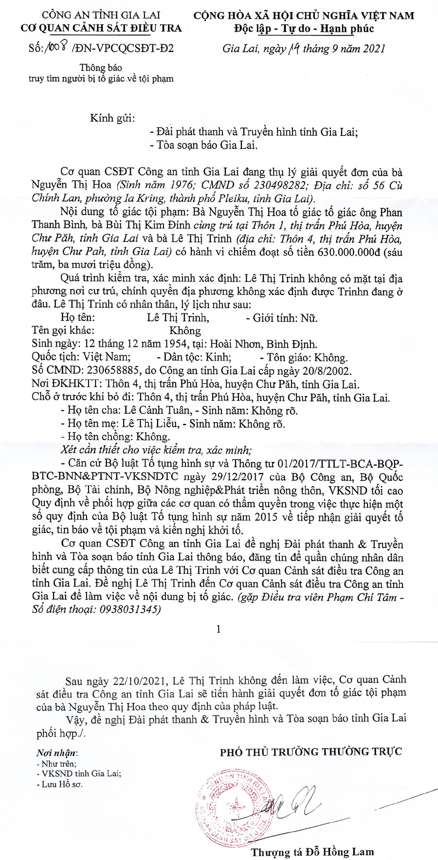 (GLO)- Cơ quan Cảnh sát điều tra (PC01) Công an tỉnh Gia Lai đang điều tra, xác minh vụ án hình sự Lê Thị Thủy can tội Lừa đảo chiếm đoạt tài sản xảy ra tại huyện Tuy Phước, tỉnh Bình Định (nay là tỉnh Gia Lai) theo Quyết định khởi tố vụ án hình sự số 637 ngày 17-10-2025.