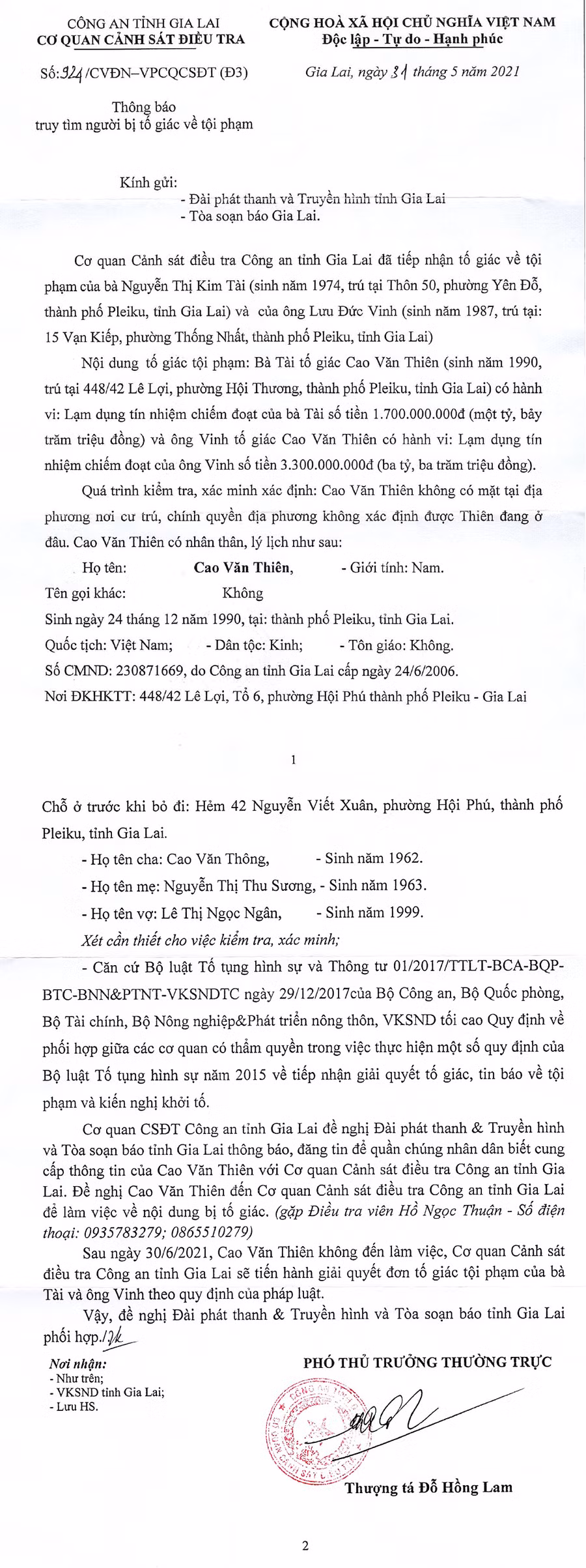 (GLO)- Cơ quan Cảnh sát Điều tra Công an tỉnh Gia Lai vừa có Thông báo số 924/CVĐN-VPCQCSĐT (Đ3) về việc truy tìm người bị tố giác về tội phạm.
