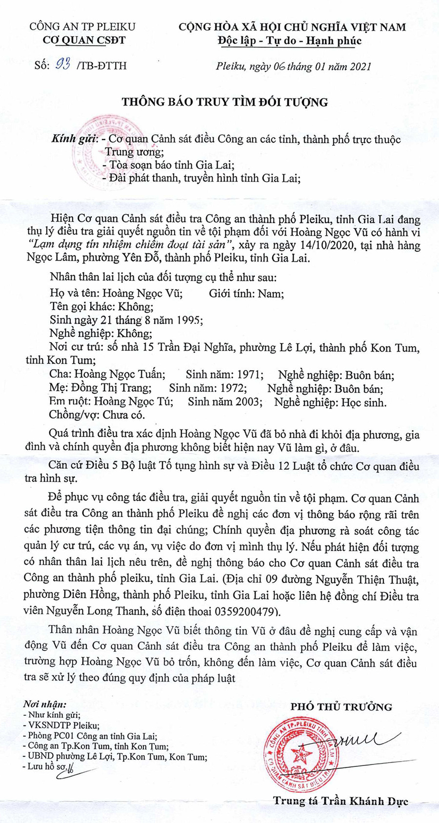 (GLO)- Ngày 6-1-2021, Cơ quan Cảnh sát Điều tra Công an TP. Pleiku ra Thông báo số 93/TB-ĐTTH về việc truy tìm đối tượng.