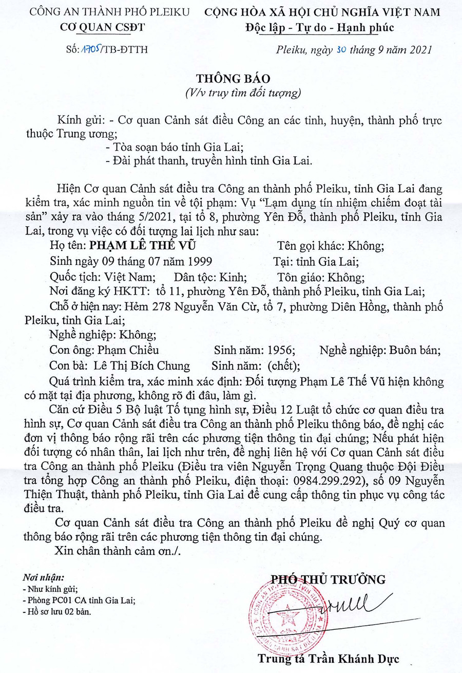 Cơ quan Cảnh sát điều tra Công an TP. Pleiku truy tìm đối tượng Phạm Lê Thế Vũ