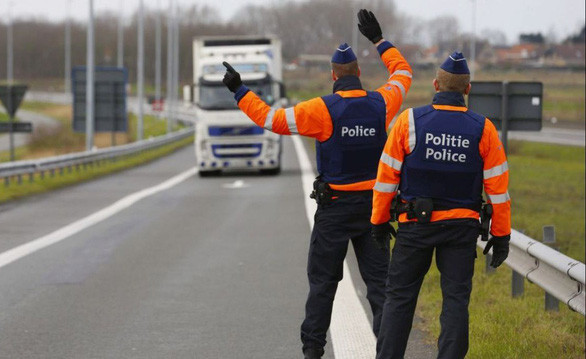 Cảnh sát Bỉ kiểm tra xe tải để ngăn chặn người di cư tìm đường sang Anh - Ảnh: MAXPPP