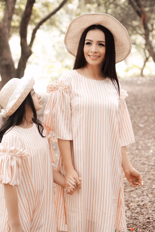 | Hai mẹ con mặc những bộ váy áo ton-sur-ton, diễn xuất tự nhiên, chân thực trước ống kính. |