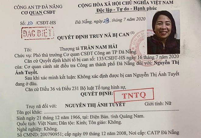 Trước đó, tháng 12.2019, Công an TP.Đà Nẵng nhận được đơn tố giác của 2 người dân ở thôn Lệ Sơn Bắc (xã Hòa Tiến, H.Hòa Vang, TP.Đà Nẵng), tố cáo bà Tuyết chiếm đoạt 1,25 tỉ đồng "tiền chạy việc cho con em". Tuy nhiên, bà Tuyết đã đi khỏi nơi cư trú từ tháng 12.2019. Đến tháng 3.2020, Công an TP.Đà Nẵng đã ra thông báo truy tìm, đề nghị bà Tuyết trình diện, nhưng không nhận được phản hồi.