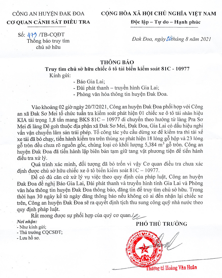 (GLO)- Cơ quan Công an huyện Đak Đoa (tỉnh Gia Lai) vừa có Thông báo số 479/TB-CQĐT về việc truy tìm chủ sở hữu chiếc xe ô tô tải BKS 81C-10977.