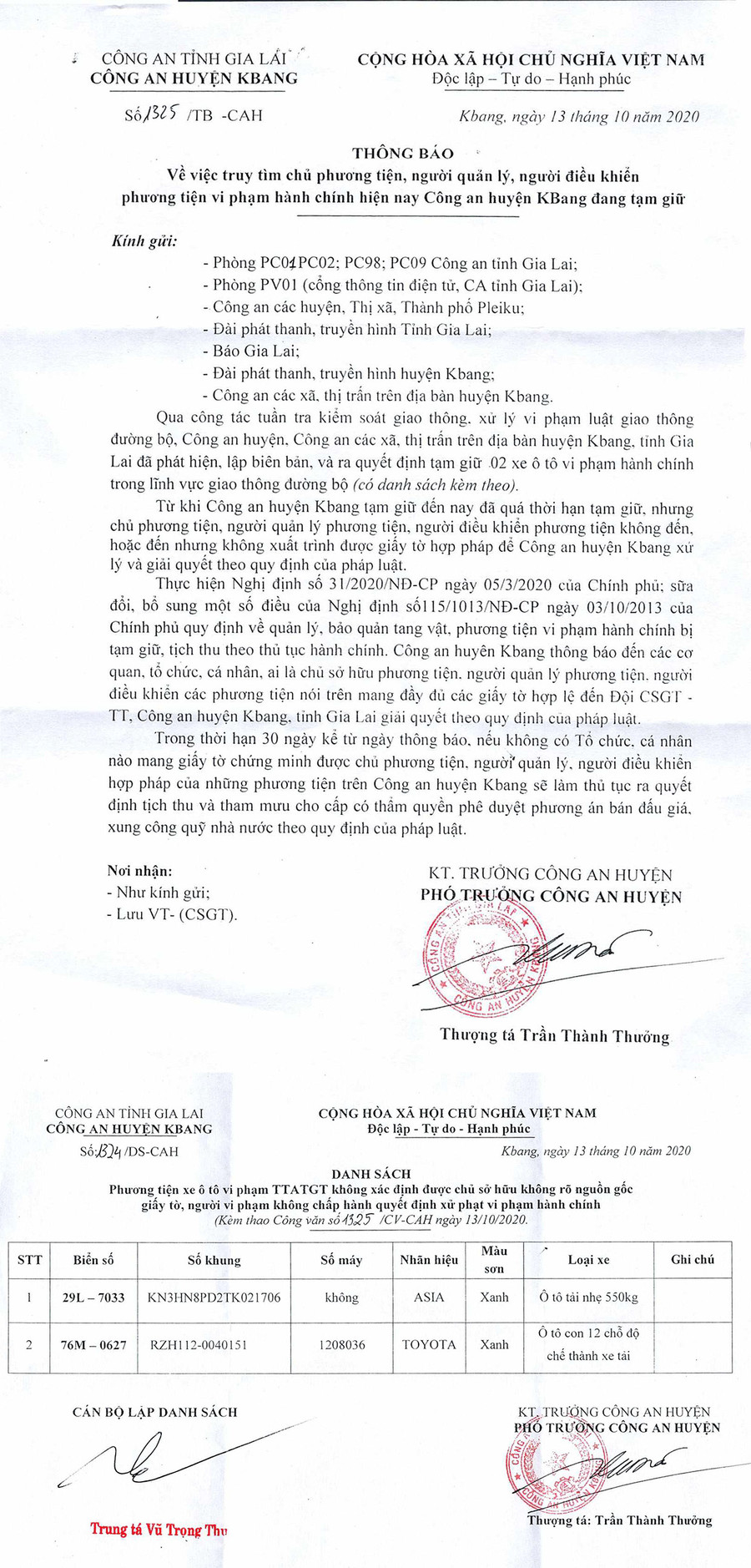 (GLO)- Công an huyện Kbang (tỉnh Gia Lai) vừa có Thông báo số 1325/TB-CAH về việc truy tìm chủ phương tiện, người quản lý, người điều khiển phương tiện vi phạm hành mà đơn vị đang tạm giữ.