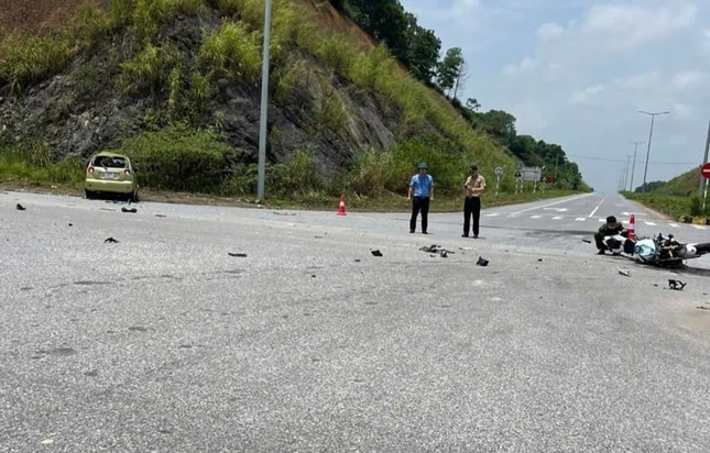 | Hiện trường vụ tai nạn giữa xe mô tô phân khối lớn và xe ô tô khiến 3 người bị thương. |