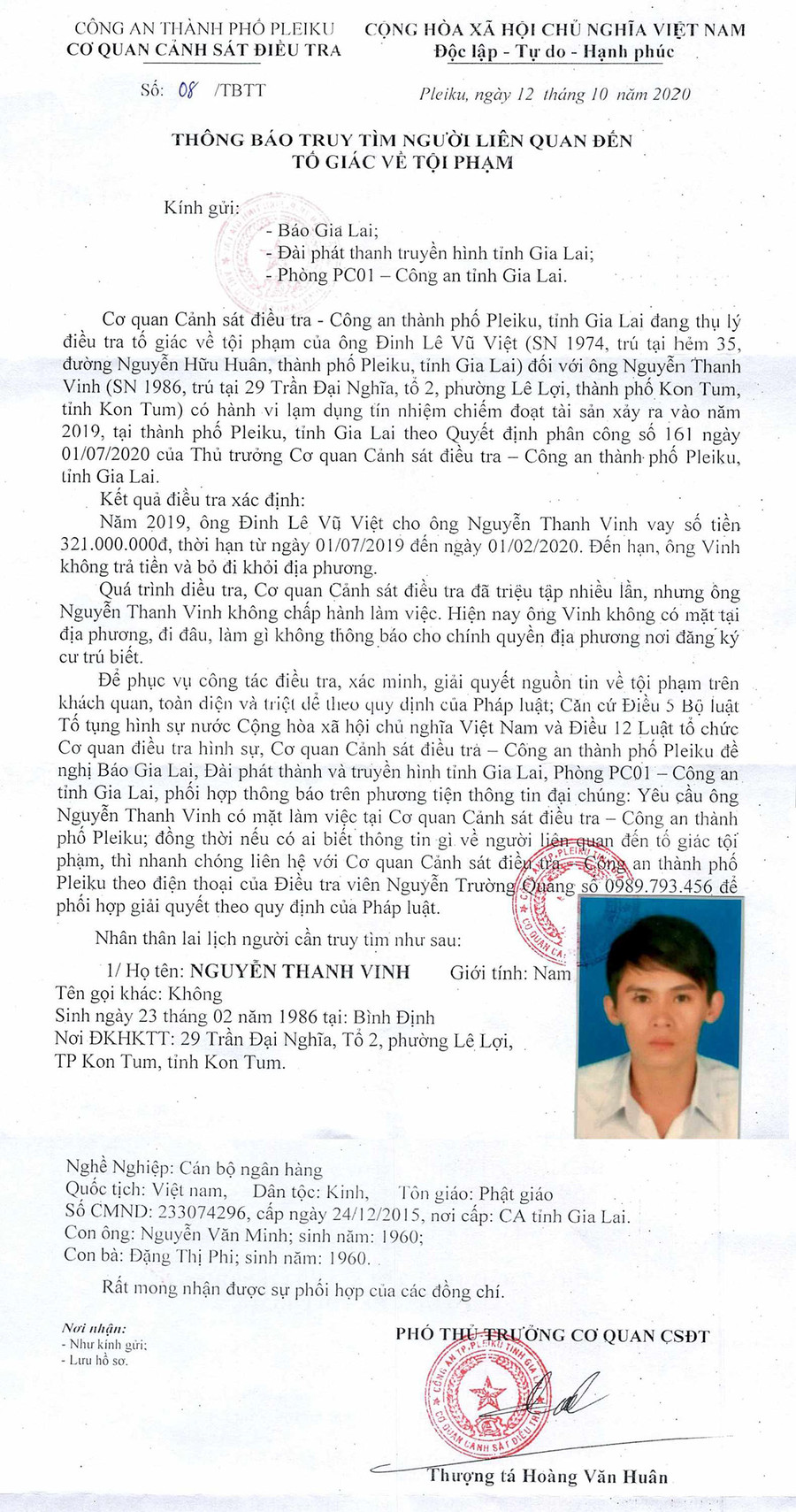 (GLO)- Cơ quan Cảnh sát Điều tra Công an TP. Pleiku (tỉnh Gia Lai) vừa có Thông báo số 08/TBTT truy tìm người liên quan đến tố giác về tội phạm.