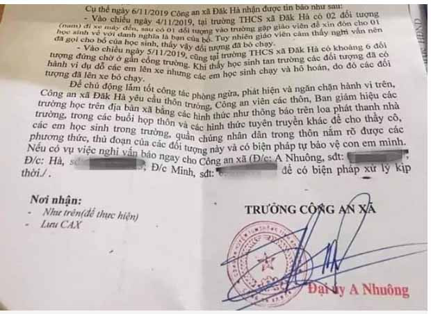 Ngày 7-11, thôn trưởng các thôn và hiệu trưởng các trường trên địa bàn xã Đắk Hà, huyện Tu Mơ Rông, tỉnh Kon Tum đã nhận được thông báo phòng ngừa các đối tượng hoạt động nghi vấn bắt cóc trẻ em từ Công an xã này.