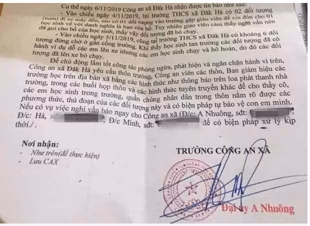 Trao đổi riêng với phóng viên Báo Người Lao Động, ông A Nhuông - Trưởng Công an xã Đắk Hà, người ký thông báo - cho biết việc phát hiện các đối tượng nghi vấn, lạ mặt từ nơi khác tới có biểu hiện bất minh nên đã làm văn bản thông báo trên gửi cho các trường, thôn để phổ biến cho giáo viên, học sinh và người dân nắm rõ phương thức thủ đoạn để phòng ngừa, ngăn chặn. Không thể để xảy ra sự vụ mới vào cuộc.