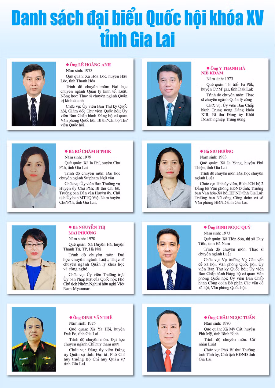 Theo đó, danh sách những người trúng cử đại biểu Quốc hội khóa XV được Hội đồng bầu cử quốc gia thông qua gồm 499 người; trong đó có 8 đại biểu của Đoàn đại biểu Quốc hội tỉnh Gia Lai (danh sách được đăng trên trang 5 số báo hôm nay).