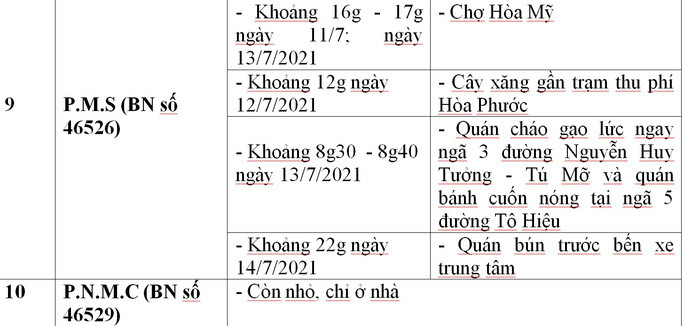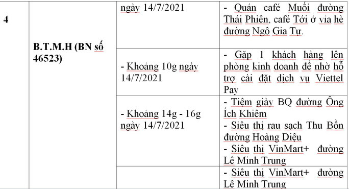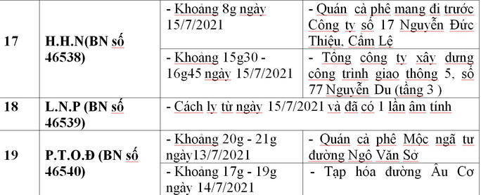Tối 17-7, Ban Chỉ đạo Phòng chống dịch Covid-19 TP Đà Nẵng đã công bố dịch tễ của 33 ca Covid-19 mới ghi nhận. Trong số này có 1 ca bệnh là nữ nhân viên chi nhánh Viettel Đà Nẵng - 95 Hùng Vương (quận Hải Châu) có lịch sử dịch tễ liên quan hàng loạt địa điểm. Bệnh nhân bị mất vị giác nên đến Bệnh viện 199 xét nghiệm và phát hiện dương tính.