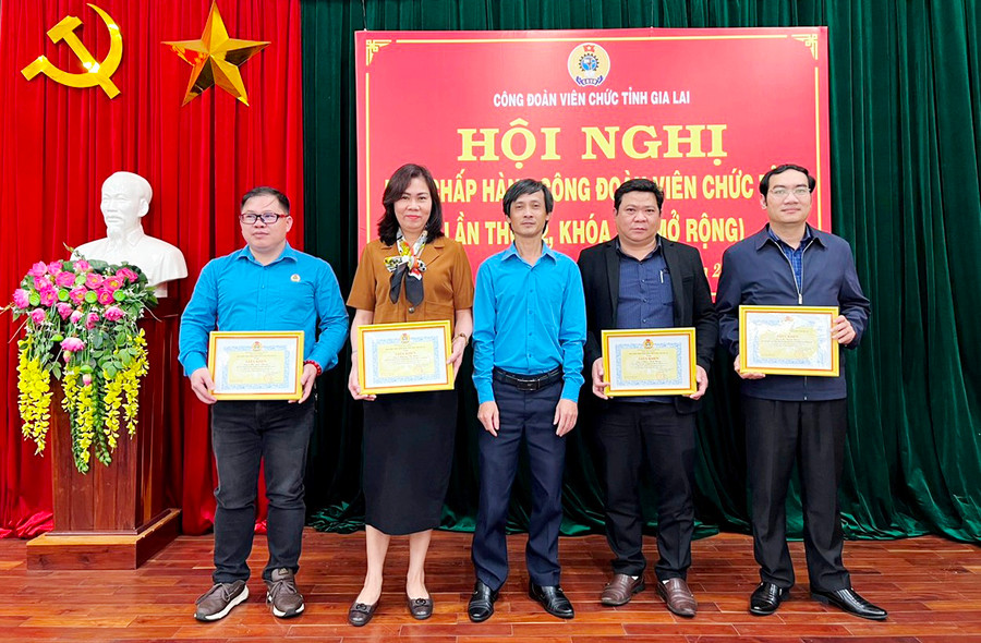 | Công đoàn Viên chức tỉnh Gia Lai tặng giấy khen cho các tập thể, cá nhân có thành tích xuất sắc trong phong trào thi đua và xây dựng tổ chức Công đoàn năm 2022. Ảnh: Đ.Y |
