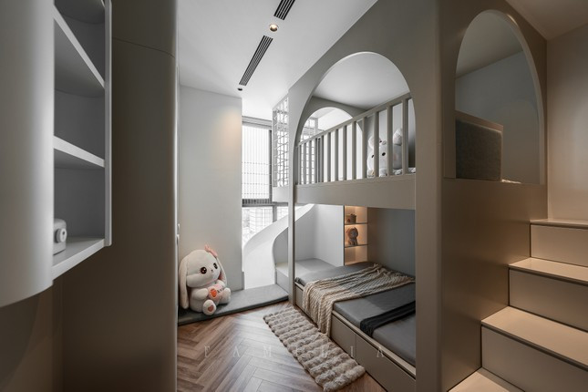 Giường ngủ hai tầng được tích hợp cả cầu trượt vui chơi cho các bé được giải trí sau những giờ học căng thẳng.
