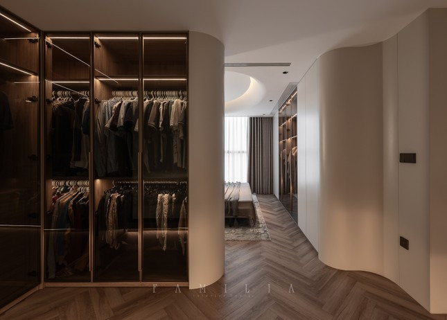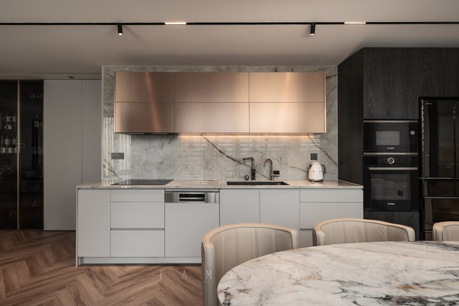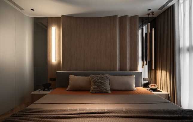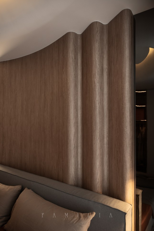 Tập trung vào chất lượng, căn hộ tích hợp những vật liệu và phụ kiện đến từ các thương hiệu nổi tiếng như gỗ An Cường, da nỉ Acacia nhập khẩu Bỉ, đá Neolith, phụ kiện Blum… cùng các chi tiết nhấn nhá phá cách như trần thạch cao đúc elip, vách đầu giường uốn cong, máy tạo lửa hơi nước… giúp không gian sống trở nên sang trọng nhưng cũng không kém phần ấn tượng, cuốn hút.