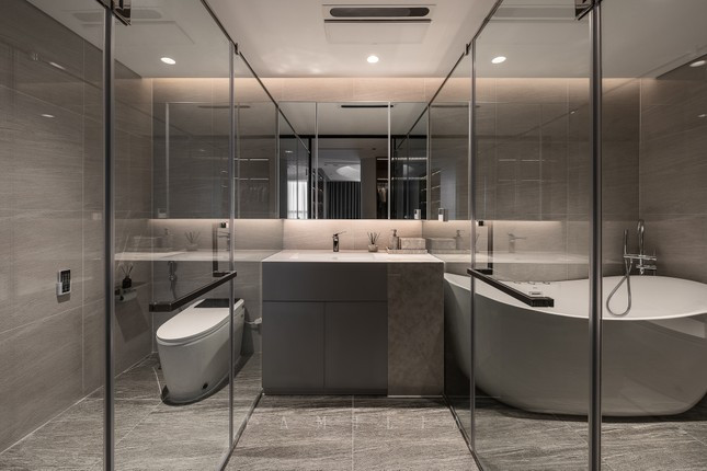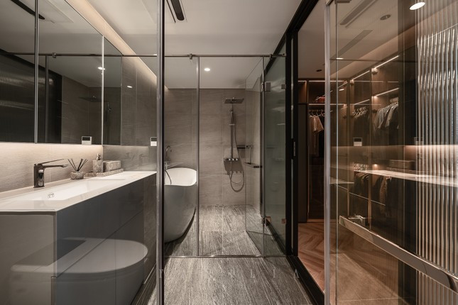 Nhà tắm và vệ sinh trong phòng ngủ lớn được ngăn cách với giường ngủ bằng hệ tủ quần áo bằng kính vừa đảm bảo riêng tư vừa đầy đủ dây chuyền công năng.