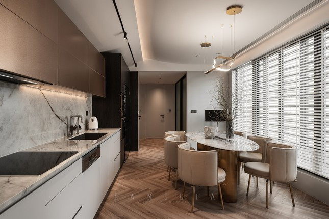 Từ thiết kế đến thi công, căn hộ được làm mới hoàn toàn. Đặc biệt, phần logia cũ của căn hộ được cải tạo thành khu vực nhà bếp nằm ở trung tâm căn hộ.