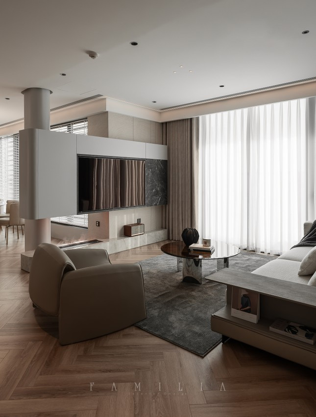Căn hộ dành cho gia đình trẻ 2 thế hệ gồm bố mẹ và 2 con nhỏ được thiết kế theo phong cách hiện đại, tối giản, tập trung vào công năng sử dụng cũng như cá nhân hóa không gian sống cho từng thành viên.