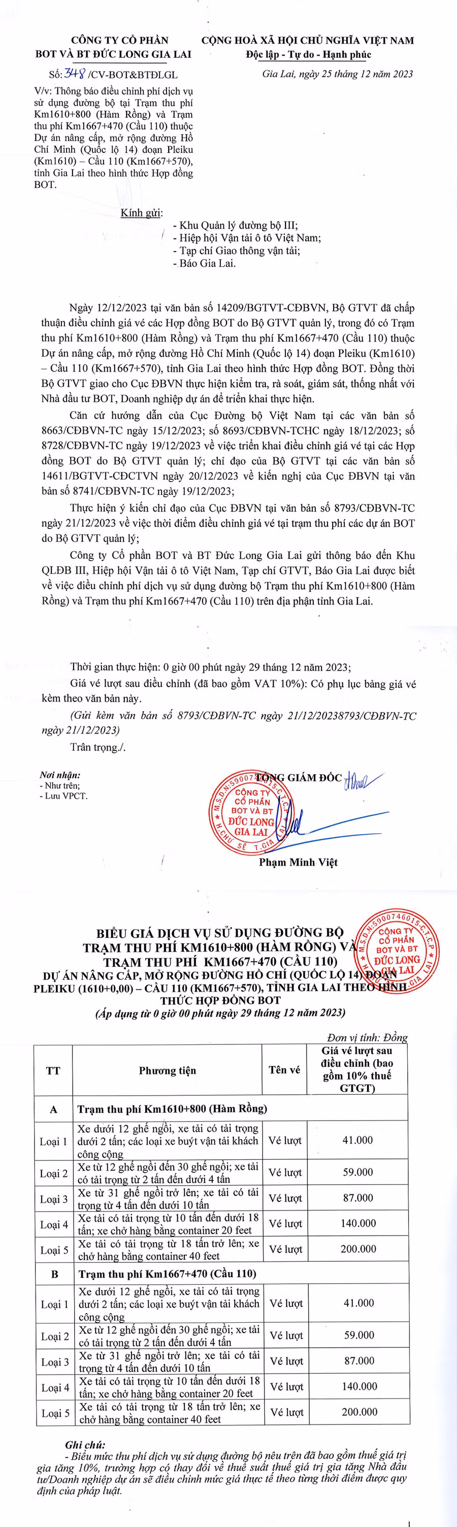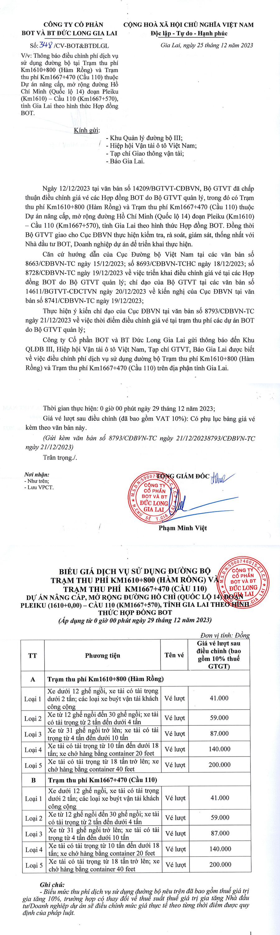 (GLO)- Từ 0 giờ ngày 29-12-2023, điều chỉnh phí dịch vụ sử dụng đường bộ tại Trạm thu phí Km49+550 trên địa phận tỉnh Bình Định và Trạm thu phí Km124+720 trên địa phận tỉnh Gia Lai thuộc dự án cải tạo, nâng cấp quốc lộ 19 theo hình thức hợp đồng BOT.