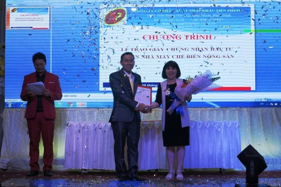 (BĐ) – Ngày 28.3, tại thị xã An Nhơn, thừa ủy quyền của UBND tỉnh, bà Huỳnh Thị Thanh Thủy, Phó Giám đốc Sở KH&ĐT đã trao Giấy chứng nhận đầu tư Dự án Nhà máy chế biến nông sản cho Công ty cổ phần Xuất nhập khẩu Tiến Phước (TP Quy Nhơn) (ảnh). Nhà máy chế biến nông sản được xây dựng trên diện tích 55.358 m2 tại khu vực Phú Sơn, phường Nhơn Hòa (thị xã An Nhơn) với hệ thống dây chuyền thiết bị hiện đại, công suất 9.500 sản phẩm bột bắp, bột mì/năm, với tổng đầu tư 90 tỉ đồng. Hiện công ty đang huy động nhân lực, phương tiện, vật liệu đẩy nhanh tiến độ thực hiện dự án, phấn đấu đưa nhà máy vào hoạt động trong năm 2017, góp phần giải quyết việc làm cho 100 lao động ở địa phương, tăng ngân sách cho tỉnh nhà.