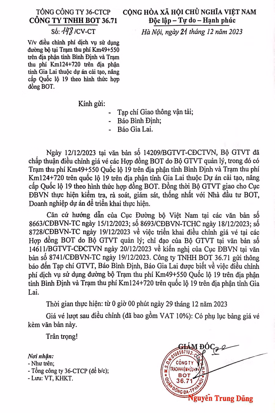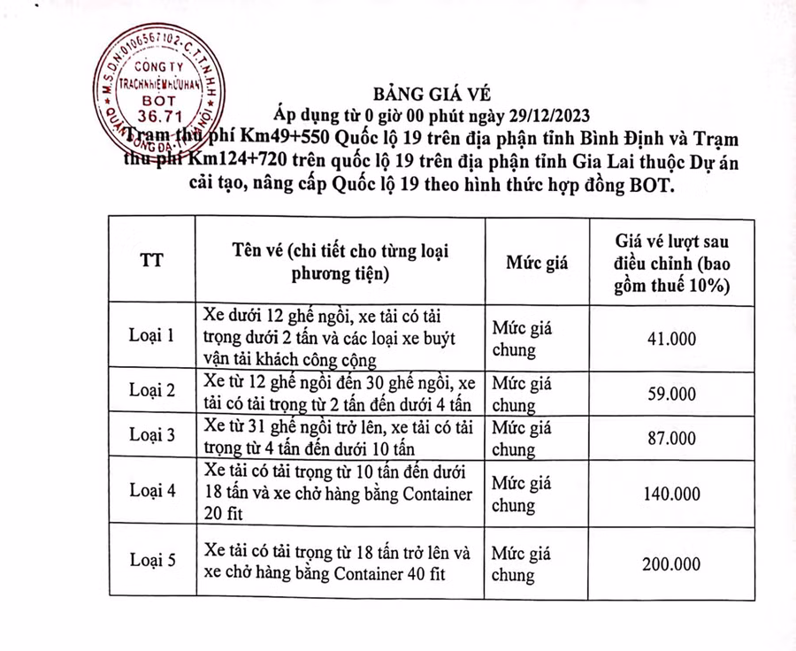 (GLO)- Từ 0 giờ ngày 29-12-2023, điều chỉnh phí dịch vụ sử dụng đường bộ tại Trạm thu phí Km49+550 trên địa phận tỉnh Bình Định và Trạm thu phí Km124+720 trên địa phận tỉnh Gia Lai thuộc dự án cải tạo, nâng cấp quốc lộ 19 theo hình thức hợp đồng BOT.