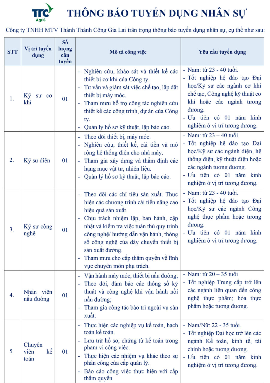 - Phòng Nhân sự - Công ty TNHH một thành viên Thành Thành Công Gia Lai