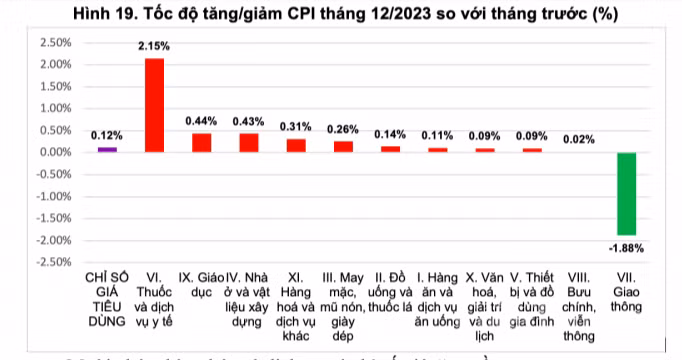 Theo Tổng cục Thống kê, tháng 12-2023 có 10 nhóm hàng hóa và dịch vụ có chỉ số giá tăng và 1 nhóm hàng có chỉ số giá giảm.