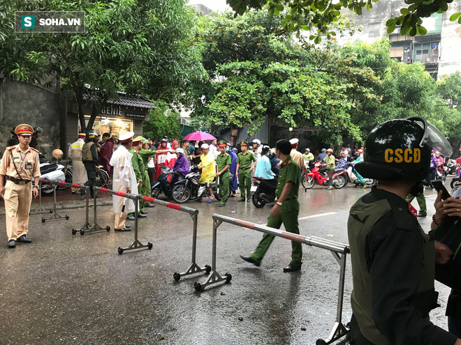 14h22: Trời đổ mưa dày hạt nhưng người dân vẫn tập trung đông, mặc áo mưa đứng theo dõi sự việc.