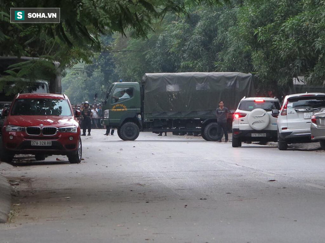 14h20: Một xe biển xanh của lực lượng công an đã chở người thân của đối tượng đang cố thủ đến trước căn nhà nói trên để vận động ra đầu thú.