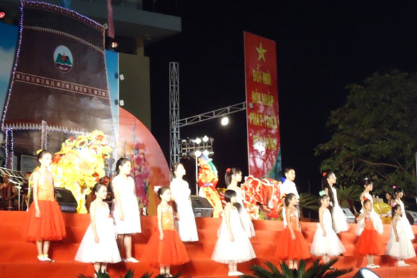 22 giờ 10: Các em thiếu nhi biểu diễn tiết mục văn nghệ mở màn chương trình chào năm mới. Thời điểm này người dân TP. Pleiku và các huyện lân cận tiếp tục đổ về khu vực diễn ra lễ hội.