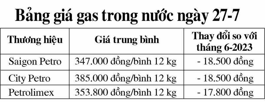 Trong khi đó, từ đầu tháng 7-2023, tại thị trường trong nước, nhiều doanh nghiệp kinh doanh gas đã thông báo điều chỉnh giảm giá mặt hàng này từ 17.800 đồng đến 18.500 đồng/bình 12 kg, tùy thương hiệu.