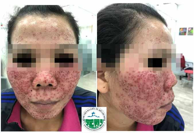 Chị T. đến “cầu cứu” bác sĩ Bệnh viện Da liễu TP HCM với khuôn mặt nổi đầy mụn mủ, bong tróc sau khi lột da bằng vi tảo biển. Ảnh: Nguyễn Thạnh