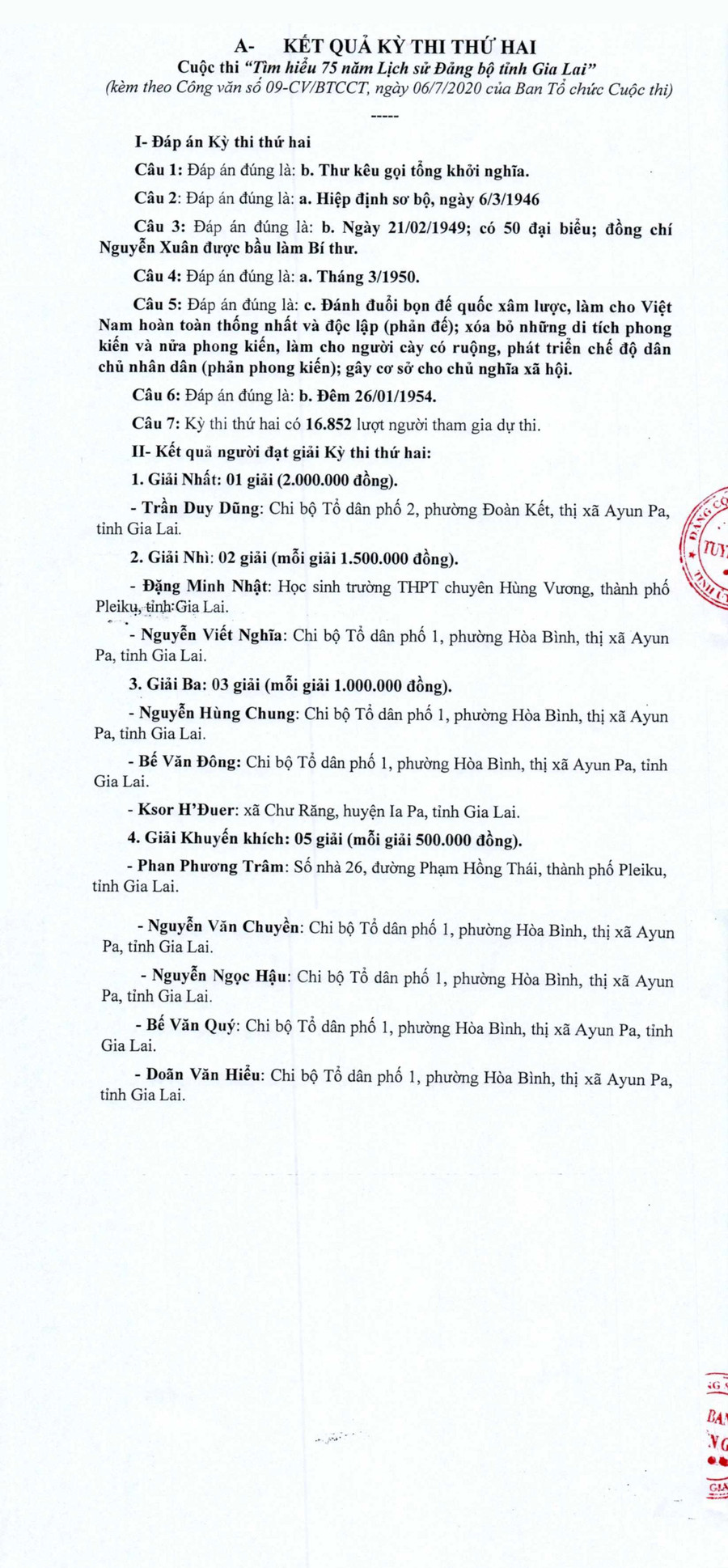 (GLO)- Ban tổ chức Cuộc thi "Tìm hiểu 75 năm lịch sử Đảng bộ tỉnh Gia Lai" công bố kết quả Kỳ thi thứ hai: