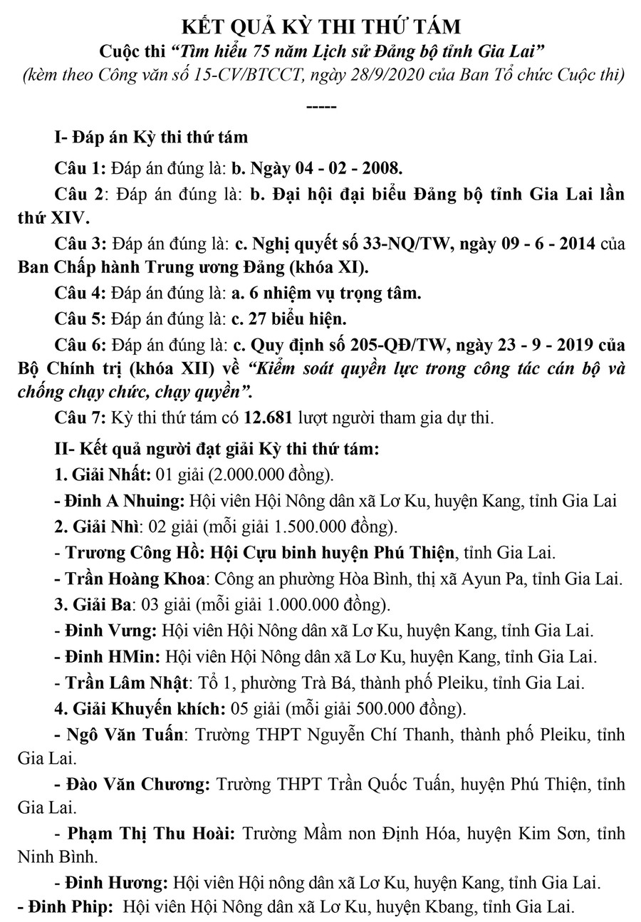 (GLO)- Ban tổ chức Cuộc thi "Tìm hiểu 75 năm lịch sử Đảng bộ tỉnh Gia Lai" công bố kết quả Kỳ thi thứ tám.